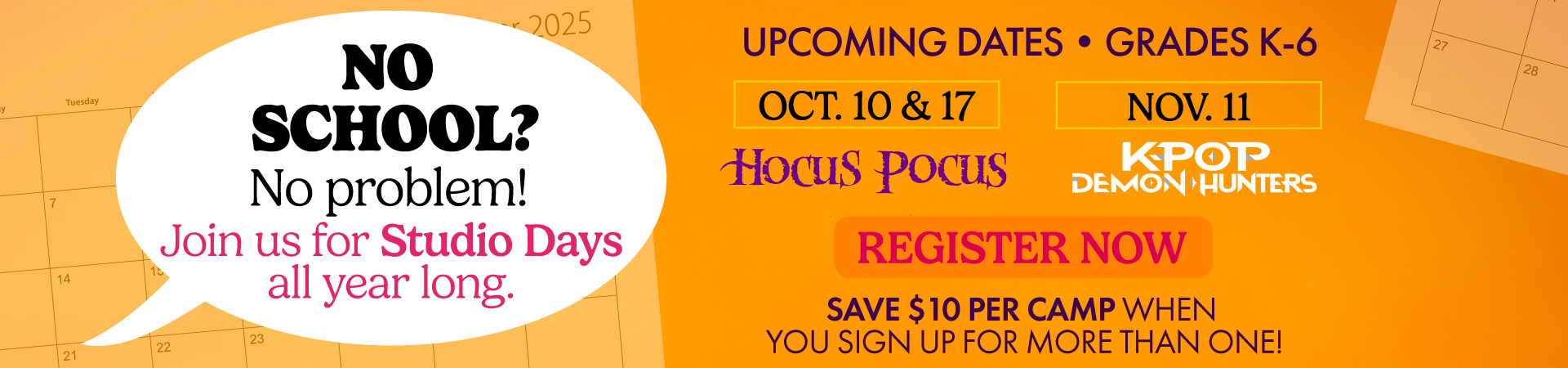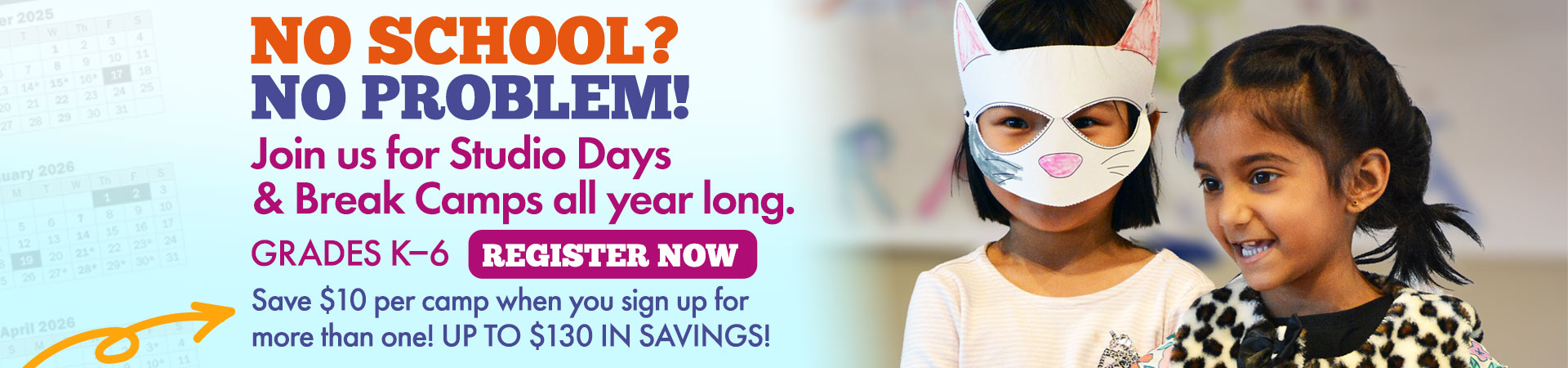 When school is out, join Studio East for a Camp Break or Studio Day! Students in grades K-6 learn new skills, make new friends, and have a great time. Save $10 on each camp when you register for more than one!